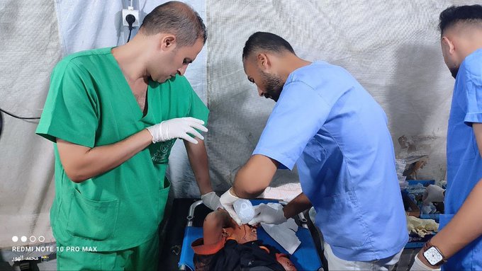 وارتقى شهيد وعدد من الإصابات باستهداف مروحية إسرائيلية خيمة نازحين بمستشفى شهداء الأقصى في مدينة دير البلح وسط قطاع غزة.