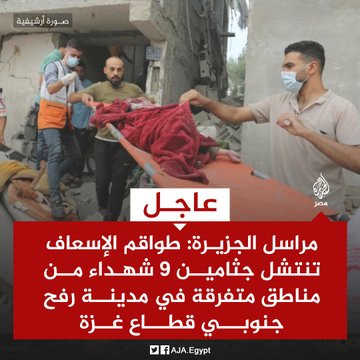 وفي مخيم الشابورة في رفح، أفادت مصادر طبية نقل جثامين 4 شهداء من محيط مسجد الرحمة إلى مجمع ناصر الطبي في مدينة خان يونس.