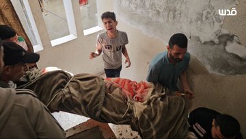 وارتقى 4 شهداء منهم شهيدة وأصيب 20 بقصف من مسيرة إسرائيلية عصر اليوم لخيمة في إيواء المناصرة شرقي مشفى الأقصى في مدينة دير البلح وسط قطاع غزة